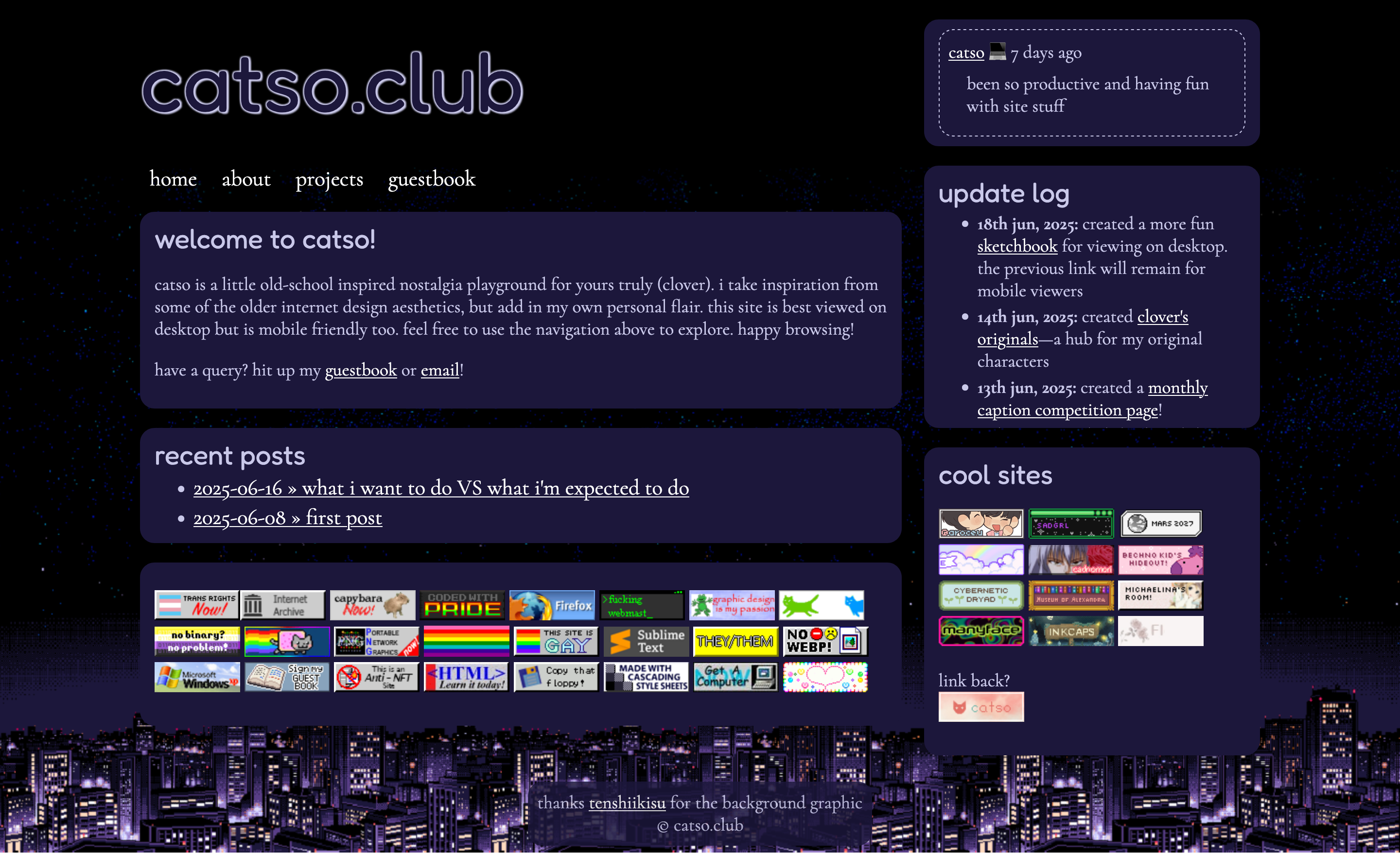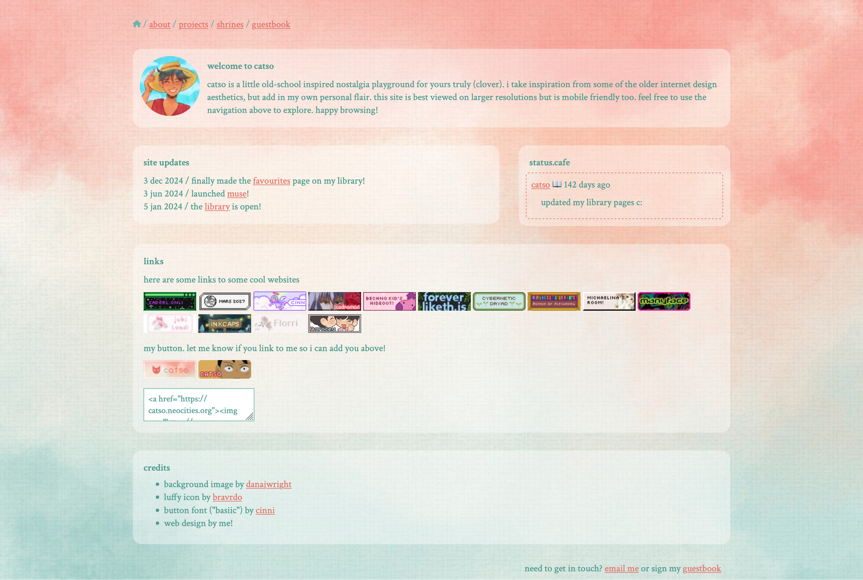 i launched version one of catso on neocities in december of 2023. i really enjoyed my time there—the community vibes were and still are great. however, it felt silly not using my own hosting, especially since it doesn't come with the limitations neocities (rightfully) has in place. version one was inspired by watercolour art.